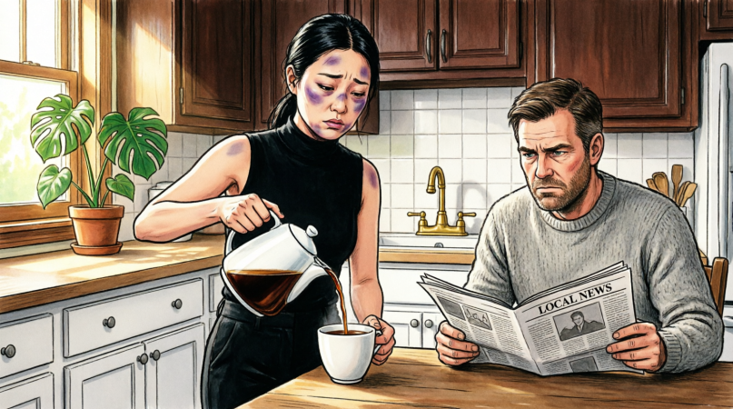 Every time I open my mouth to eat something, I feel the bruise stretch over my jaw, warm, throbbing, as if reminding me that I’m still here.