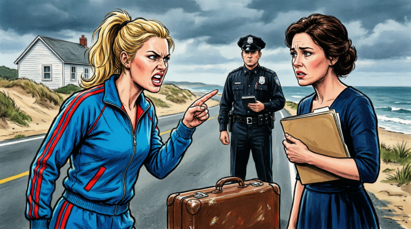 She was wearing designer workout gear, all sleek black and neon accents, her blond hair pulled back into a tight ponytail that didn’t dare move in the breeze. The outfit looked like it belonged in some elite city gym, not on the front steps of a weather-beaten beach house that had seen more fishing nets and sandy feet than yoga mats.