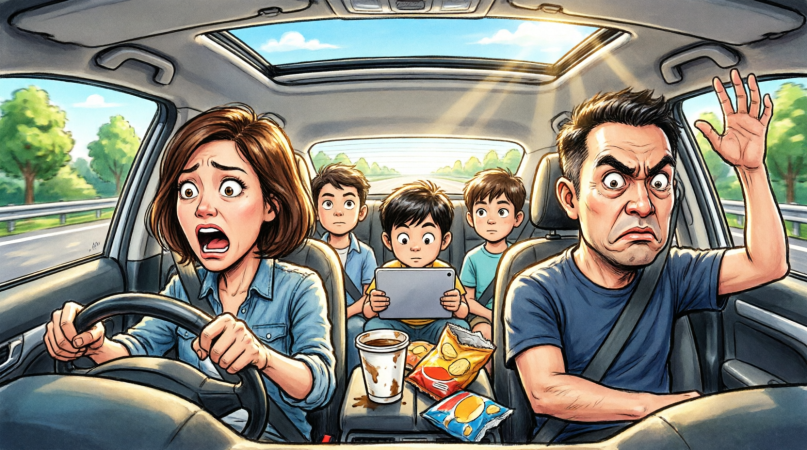 In the back seat, our middle child’s cartoon paused, replaced by that suspicious silence kids get when they realize adults are lying.