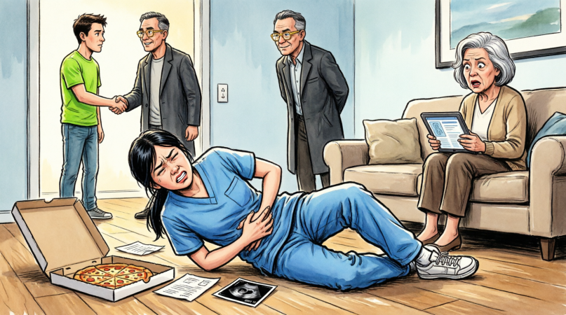 I was still in hospital scrubs. Not because I’d forgotten to change… but because I hadn’t had the strength. A few hours earlier, an ER doctor had looked at me with a softness that felt like pity and said the words that split my life in half.