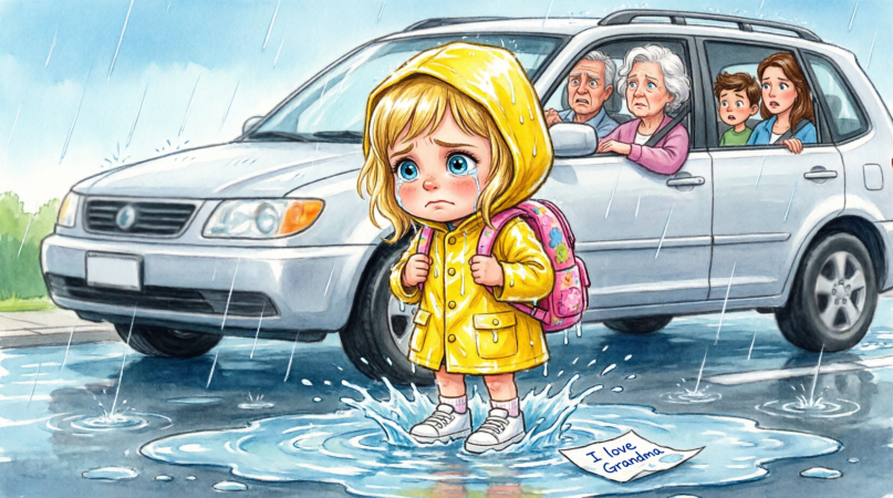 At school pickup, my parents drove off with my sister’s kids right in front of my daughter. When she ran up to the car expecting a ride home, mom rolled down the window and said, “Walk home in the rain like a stray.” My daughter pleaded, “But grandma, it’s pouring and it’s miles away.” They just drove off, leaving my six-year-old standing there soaked and crying…